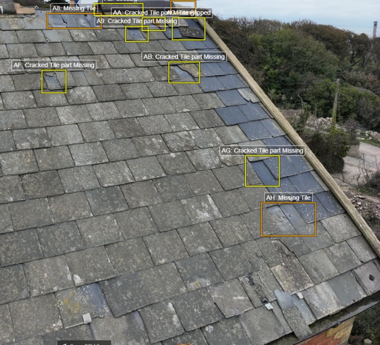 Our model pinpoints the exact location of every issue: cracked, slipped or chipped tiles, moss or vegitaion growth, flashing failures, drainage problems all displayed in a clear, interactive 3D view of your roof.